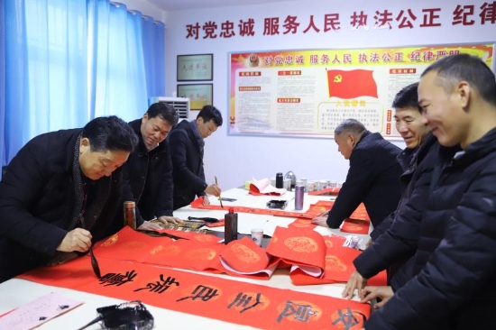 年末歲尾,我市書法家們到農(nóng)村、進(jìn)社區(qū)為群眾們義寫春聯(lián),成為節(jié)前一道靚麗風(fēng)景線。1月16日,我市6位知名書法家來(lái)到周口港區(qū)公安分局,特意為節(jié)日期間還要堅(jiān)守工作一線的公安民警、輔警現(xiàn)場(chǎng)寫春聯(lián),送祝福。