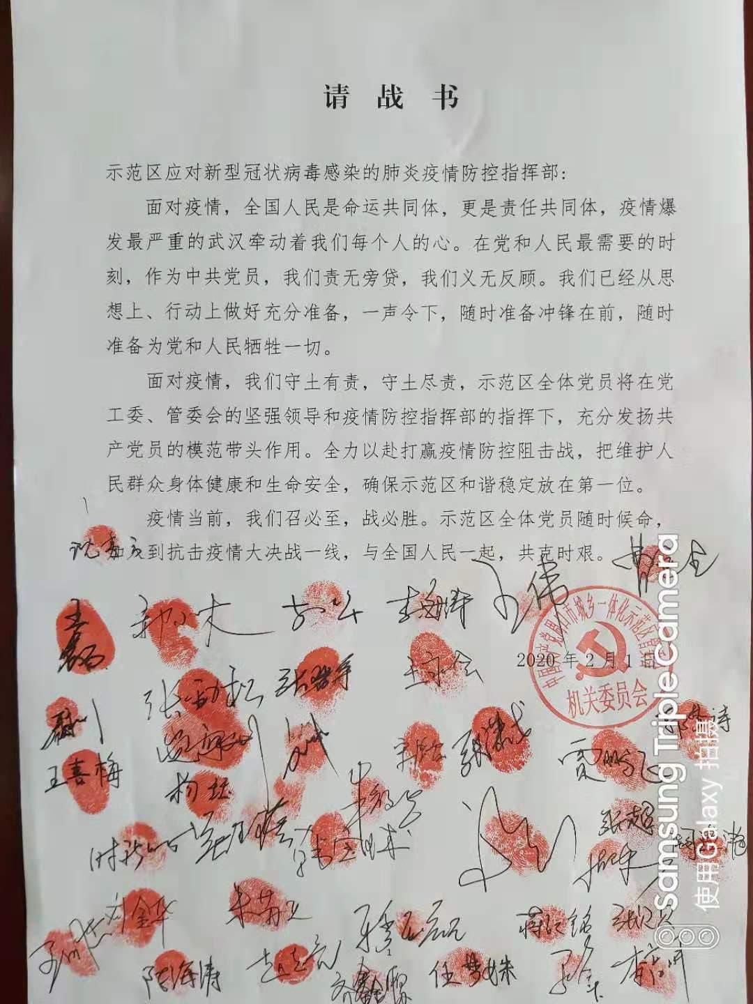 為了能到戰(zhàn)“疫”一線,示范區(qū)廣大黨員干部紛紛簽下“請(qǐng)戰(zhàn)書”,自愿要求加入到抗擊新型冠狀病毒感染的肺炎疫情戰(zhàn)斗中去?!罢?qǐng)戰(zhàn)書”上,他們紛紛按下鮮紅的指印,在指印下面,是每個(gè)黨員堅(jiān)定的簽名,從這些指印和簽名可以看出每個(gè)黨員堅(jiān)定的黨性和為了抗擊疫情大無畏的英雄氣概。