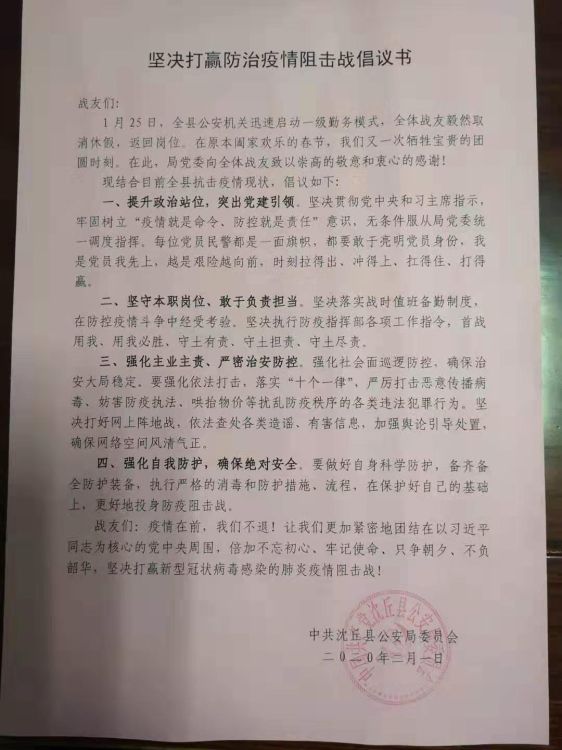 自全省啟動抗擊新型冠狀病毒引發(fā)肺炎疫情的一級響應(yīng)后,沈丘縣公安機關(guān)迅速啟動一級勤務(wù)模式,在這場舉國同頻共振的防治疫情偉大斗爭中,突出戰(zhàn)時黨建引領(lǐng),為堅決打贏疫情奠定了堅實的組織保障。