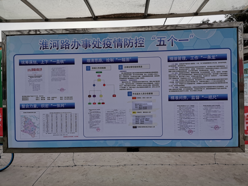 淮河路辦事處地處我市東南部,總人口約4萬。轄區(qū)黃灘、孟營、鄭洼、牛灘、劉新莊、姚灘、南徐、路莊、趙寨、麥仁店、康樓、徐莊等12個居委會,有34個自然村,114個村民組,人口約39000人、面積20平方公里。根據(jù)轄區(qū)的實疫情防控工作,淮河路辦事處探索出一套疫情防控工作“五個一”流程。統(tǒng)籌謀劃,上下“一盤棋”; 整合力量,織密“一張網(wǎng)”; 理清思路,繪制“一幅圖”;精細管理,工作“一條龍”;精準問責,監(jiān)督“一把尺”。