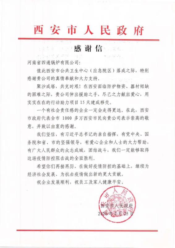 “聚沙成塔,共克時艱!在西安面臨防護物資、器材短缺的困難之際,貴公司伸出援助之手,盡己之力獻出愛心,在此西安市政府代表全市1000多萬西安市民向貴公司表示由衷的感謝”。這是西安市政府對太康縣拔尖人才、河南省四通鍋爐有限公司總經(jīng)理馮坤的感謝信。一方有難,八方支援。在新聞上了解到武漢新冠肺炎疫情突發(fā)的情況后,他連夜與中國紅十字會和武漢紅十字會取得聯(lián)系,詢問向新建的火神山醫(yī)院捐贈醫(yī)用鍋爐和捐款事宜,通過網(wǎng)上銀行將30萬善款轉(zhuǎn)入武漢紅十字會賬戶中。
