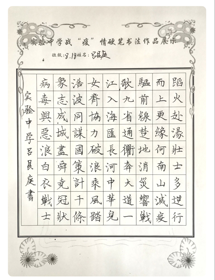 “赴湯蹈火壯士多,逆行而上更緣何。南山滅疫驅(qū)前線,楚地消災(zāi)響戰(zhàn)歌。九省通衢奔大道,一江入海匯長(zhǎng)河。中華兒女齊協(xié)力,破浪乘風(fēng)踏浩波......”扶溝縣實(shí)驗(yàn)中學(xué)“萬(wàn)眾一心 抗擊新冠”硬筆書(shū)法比賽中,八(18)班呂艮庭同學(xué)鄭重地抄錄了這首律詩(shī)。