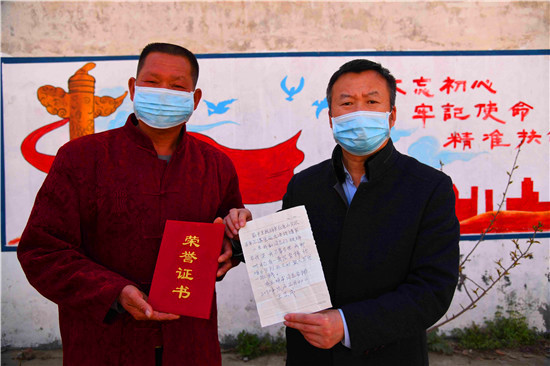 “疫情風(fēng)聲鶴唳,村里還有10家從武漢回村過年的村民,大年初一,上面要求封村了,鄉(xiāng)親們還是亂跑,到河邊扎堆釣魚,攆不散”,王志成說,他心急如焚,深知疫情嚴(yán)重,在這種情況下,一家人感染,一個村子的人咋辦?,一定得有人管。他在街上碰見十一組村民、退伍兵王明甫,兩人想法相合,隨即決定,成為自愿抗疫小分隊,自己籌備物質(zhì),開展動員村民居家抗疫、幫助困難村民、對村里實施消毒等抗疫事宜。王明甫向縣農(nóng)發(fā)行駐村第一書記王長海匯報后,得到大力支持。