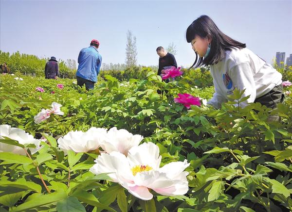 圖二 4月7日,在周口經濟開發(fā)區(qū)淮河路辦事處小牛莊的一個花圃內,千余株牡丹相繼吐蕊,吸引不少市民前來賞花。近年來,我市不斷對中心城區(qū)進行改建,著力提升城市的園林綠化水平,切實激發(fā)了城區(qū)周邊農民種植花卉、草木的熱情。 記者 孫安平 攝