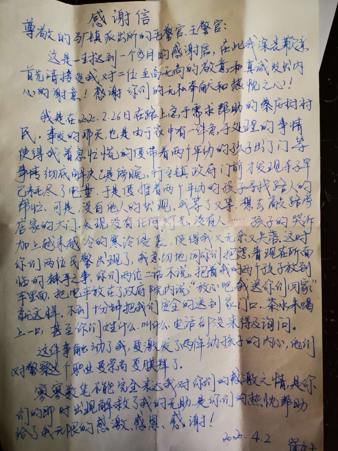 從聊天中得知,該女士姓崔,家距離衛(wèi)生院較遠(yuǎn)而且家里有兩名老人,她的丈夫又在外地。看完病,派出所所長(zhǎng)毛衛(wèi)庚指示巡警民警把崔女士和孩子們安全護(hù)送到家。后來(lái),崔女士家人多次聯(lián)系毛衛(wèi)庚說(shuō)要表示感謝,都被民警們謝絕。