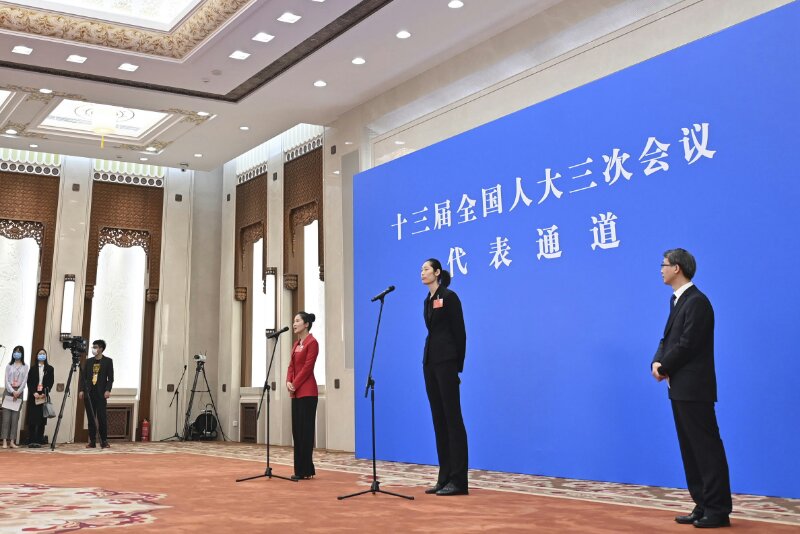 5月22日,第十三屆全國(guó)人民代表大會(huì)第三次會(huì)議舉行首場(chǎng)“代表通道”采訪(fǎng)活動(dòng)。這是全國(guó)人大代表朱婷(右二)通過(guò)網(wǎng)絡(luò)視頻方式接受采訪(fǎng)。新華社記者 劉金海 攝