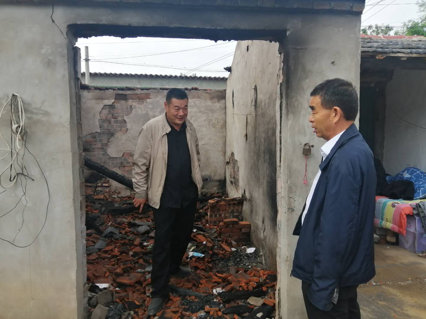 聽(tīng)完情況后,督導(dǎo)組立刻和駐村工作人員一起到李洪范家查看情況,現(xiàn)場(chǎng)主屋已經(jīng)全部燒毀,屋里到處是瓦礫......李洪范站在被燒毀的房屋里,表情木納的自言自語(yǔ)道“燒得一干二凈,什么都沒(méi)了,這以后咋弄呀?!爆F(xiàn)場(chǎng)詢問(wèn)其生活情況時(shí),李洪范說(shuō),“當(dāng)天,鄉(xiāng)里邊就送來(lái)了米、油和錢。村長(zhǎng)也送來(lái)了幾件衣服,現(xiàn)在就是沒(méi)有地方住?!?/p>