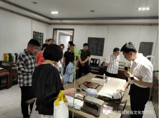 由于當(dāng)天是禮拜六,孩子們和大人來的特別多,陸陸續(xù)續(xù),穿梭不停,其中最大的一個游客團由20多人,孩子們牽著大人的手,游百獅園,參觀華威綜合展廳的木質(zhì)榨油機和書畫,到華威學(xué)堂看拓片技藝,觀看香文化。