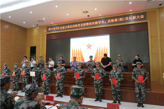 黨管武裝建設國防,軍民攜手共筑長城。為健全武裝工作組織領導體系為推動國防動員和后備力量建設在基層末端落實,7月16日上午,周口市川匯區(qū)召開基層武裝黨支部暨政治教導員、武裝委(組)員任職大會。周口軍分區(qū)司令員湯維政,區(qū)委書記、區(qū)人武部黨委第一書記李宗喜,市委組織部處級干部宋陽,區(qū)人武部政委高新傳、部長陳繼芳及城鄉(xiāng)一體化示示范區(qū)、經(jīng)濟開發(fā)區(qū)、港口物流產(chǎn)業(yè)聚集區(qū)等有關負責同志參加了大會。會上設立了18個基層武裝黨支部,任命了15名基層武裝部政治教導員、20名村(社區(qū))武裝委(組)員任職命令,武裝部政治教導員、武裝預建黨支部書記和兼職武裝委(組)員代表先后作了履職承諾發(fā)言,湯維政等為新任命的人員頒發(fā)了任職證書。
