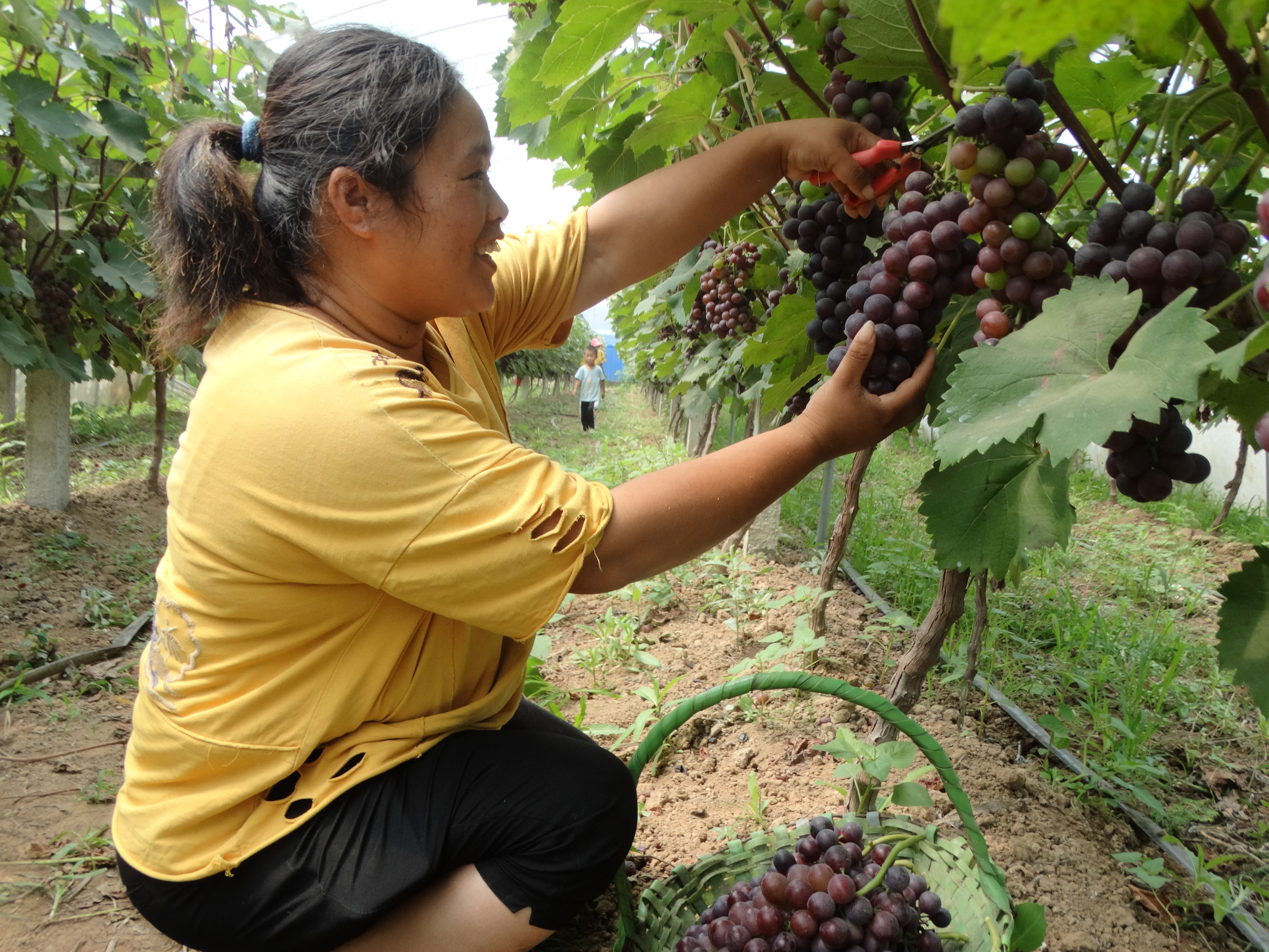 7月20日,沈丘縣周營(yíng)鎮(zhèn)王寨村返鄉(xiāng)農(nóng)民工王紅兵創(chuàng)辦的大棚生態(tài)葡萄采摘園基地內(nèi),當(dāng)?shù)夭簧偃罕娫隗w驗(yàn)休閑采摘葡萄、拍視頻的樂(lè)趣。