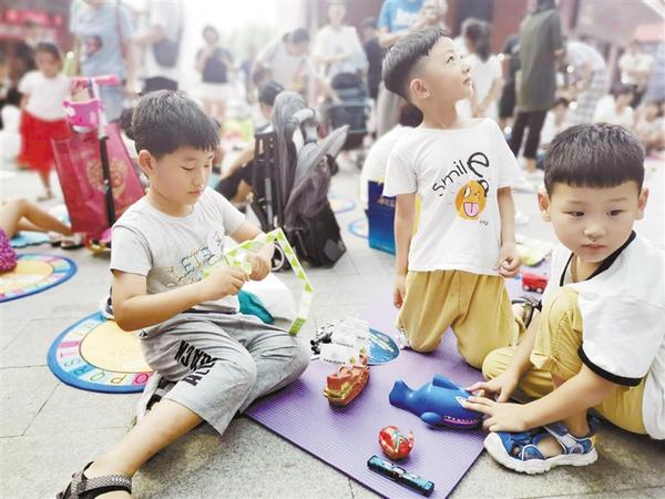 記者在現(xiàn)場看到,小朋友拉起了橫幅,擺上了玩具,搖身一變“小掌柜”,紛紛拉貨練攤、討價還價、吆喝售賣。
