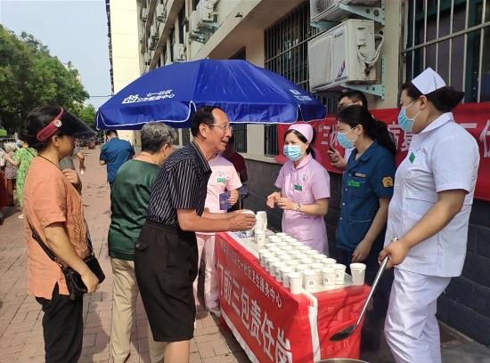 為弘揚中醫(yī)藥文化,提高群眾身體素質(zhì),連日來,周口市第二人民醫(yī)院七一社區(qū)衛(wèi)生服務(wù)中心開展冬病夏治三伏湯免費飲用活動,吸引了眾多市民參加。圖為醫(yī)護人員正給市民講解冬病夏治相關(guān)知識,并送上三伏湯。