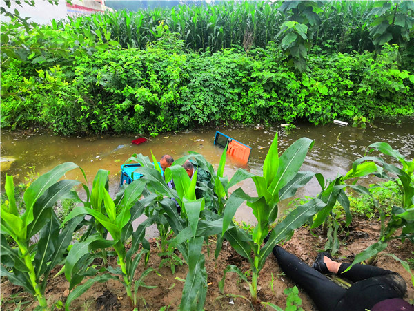 7月26日,連續(xù)多日的降雨已導(dǎo)致農(nóng)村坑滿河平、積水頗深。當(dāng)日下午4時,依然時雷聲陣陣、雨如豆粒,二人在宜路鎮(zhèn)張寨村小學(xué)附近的玉米田間拍照核查“圖斑”時,看到一輛車箱內(nèi)載有幾位老人的電動三輪車冒雨從路邊疾駛過去。緊接著聽到“撲通”一聲,趙文波、李偉二人立即意識到是三輪車掉進路溝、落水了。