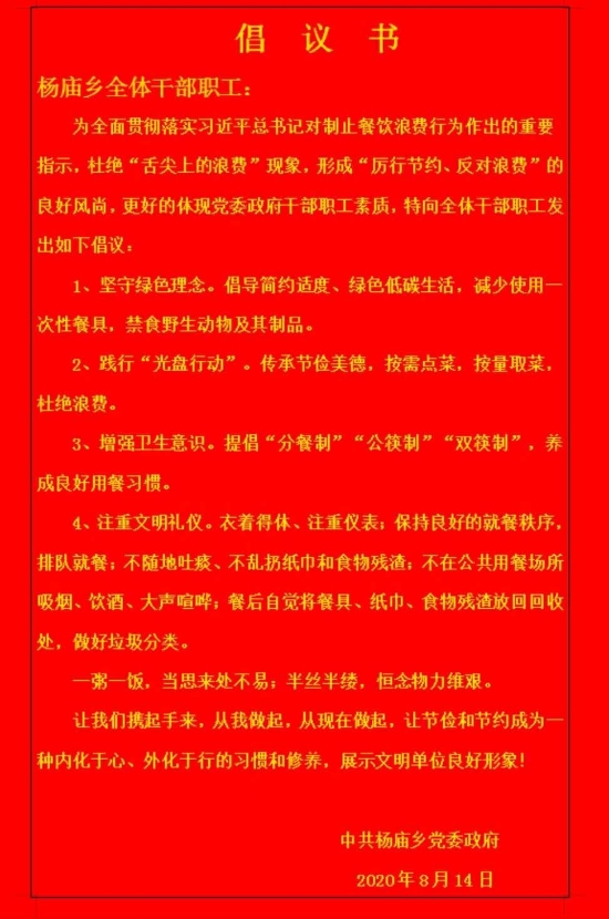 據(jù)楊廟鄉(xiāng)黨委書記聶運(yùn)亨介紹,該鄉(xiāng)積極響應(yīng)總書記號召,向全鄉(xiāng)干部發(fā)出了堅(jiān)守綠色理念、踐行光盤行動、增強(qiáng)衛(wèi)生意識、注重文明禮儀等四個方面的倡議,讓全鄉(xiāng)干部從我做起,從現(xiàn)在做起,使勤儉節(jié)約成為習(xí)慣和修養(yǎng)。