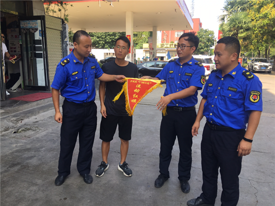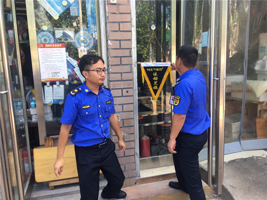 夏日的陽光透過清澈的天空照下來,街很凈,樹很綠。8月18日是開發(fā)區(qū)城管稽查大隊進行“門前三包”流動紅旗和流動黑旗評選的日子。開發(fā)區(qū)城管稽查大隊工作人員根據(jù)綜合評比標準,分別為“門前三包”工作突出的門店懸掛流動紅旗,為“門前三包”工作不力的門店懸掛黑旗。