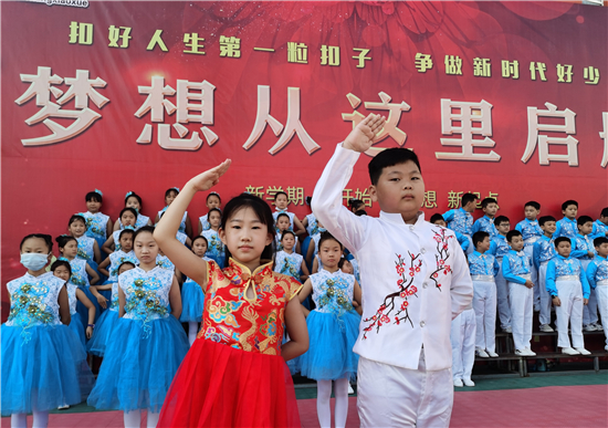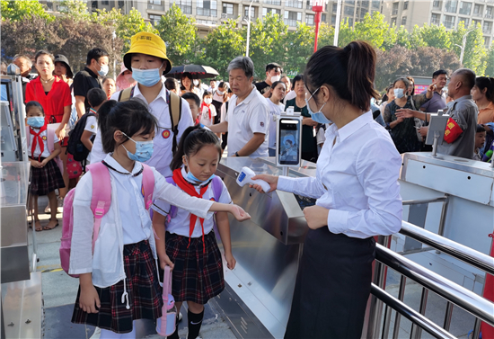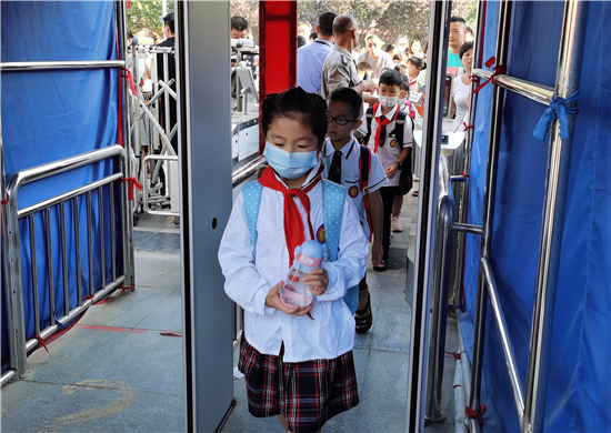 9月7日早上,周口市文昌小學(xué)的學(xué)生有序排隊(duì)測(cè)量體溫后進(jìn)入學(xué)校。據(jù)文昌小學(xué)校長(zhǎng)介紹,全市中小學(xué)實(shí)行錯(cuò)峰開學(xué)。今天是小學(xué)開學(xué)時(shí)間,文昌小學(xué)學(xué)生每個(gè)年級(jí)實(shí)行錯(cuò)時(shí)上下學(xué),學(xué)生入校要測(cè)體溫,并為一年級(jí)新生舉辦了主題為“夢(mèng)從這里啟航”的“迎新儀式”。