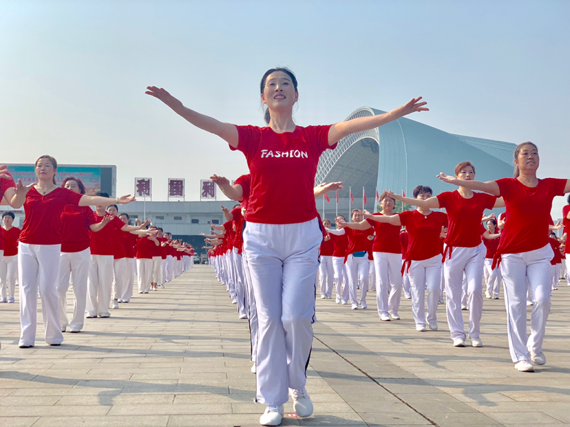在活動(dòng)現(xiàn)場(chǎng),身穿紅色上衣,白色長(zhǎng)褲的廣場(chǎng)舞愛好者隨著音響里傳來的指令,面帶笑意舞動(dòng)著。