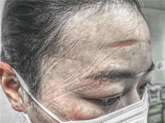 因為新冠肺炎的強傳染性,胡奔奔每次去病區(qū)上班都要全副武裝,而且為保證在6個小時的工作時間內(nèi)不被暴露,不能去衛(wèi)生間,不能喝水,還要穿上成人紙尿褲以防萬一。這樣下來,汗?jié)褚路浅J?,而且下班后脫掉防護裝備后,她原本清秀白皙的臉上,滿是深深的皺褶,久久難以恢復(fù),惹人心疼。給家人報平安時,胡奔奔甚至不敢視頻聊天,只能語音安慰家人。