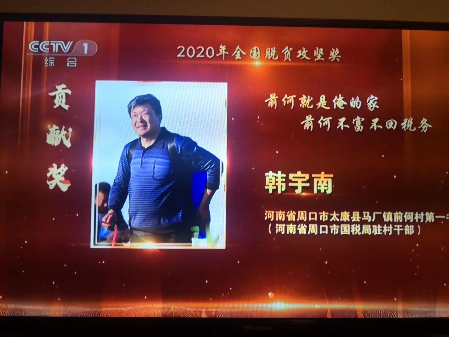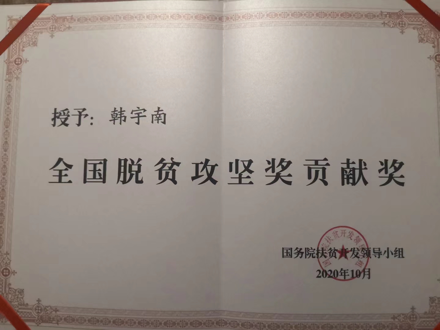 10月17日,2020年全國脫貧攻堅獎表彰大會暨首場脫貧攻堅先進事跡報告會在北京舉行。當天,國務院扶貧開發(fā)領(lǐng)導小組辦公室官網(wǎng)發(fā)布了關(guān)于表彰2020年全國脫貧攻堅獎的決定,太康縣馬廠鎮(zhèn)前何村第一書記韓宇南榮獲全國脫貧攻堅貢獻獎。