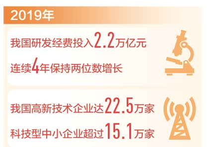 科技創(chuàng)新助推高質(zhì)量發(fā)展,我國創(chuàng)新型經(jīng)濟(jì)格局初步形成。截至2019年,全國高新技術(shù)企業(yè)達(dá)到22.5萬家,科技型中小企業(yè)超過15.1萬家。作為培育高新技術(shù)產(chǎn)業(yè)的重要載體,高新區(qū)5年來量質(zhì)同步提升。2019年,169家國家高新區(qū)生產(chǎn)總值達(dá)12萬億元,經(jīng)濟(jì)總量占全國的1/10以上。