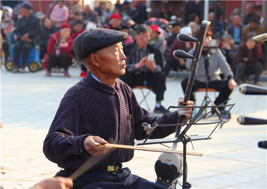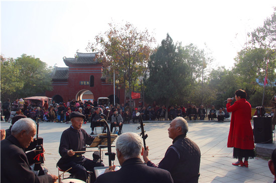 11月10日,戲迷朋友在商水縣郝崗鎮(zhèn)北社村千年古塔旁表演戲曲節(jié)目。初冬時節(jié),暖陽普照,壽圣寺古塔附近的戲迷和樂器愛好者自發(fā)來到千年古塔旁表演戲曲節(jié)目,為當(dāng)?shù)厝罕娝蜕暇实奈幕蟛?,進(jìn)一步活躍了農(nóng)村文化生活。①15周口日報·周道客戶端記者付永奇 通訊員 呂耀光 攝