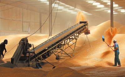 許昌市建安區(qū)陳曹鄉(xiāng)雙廟村金豐公社農業(yè)服務有限公司,工作人員在糧倉中整理剛剛入庫的小麥。資料圖片