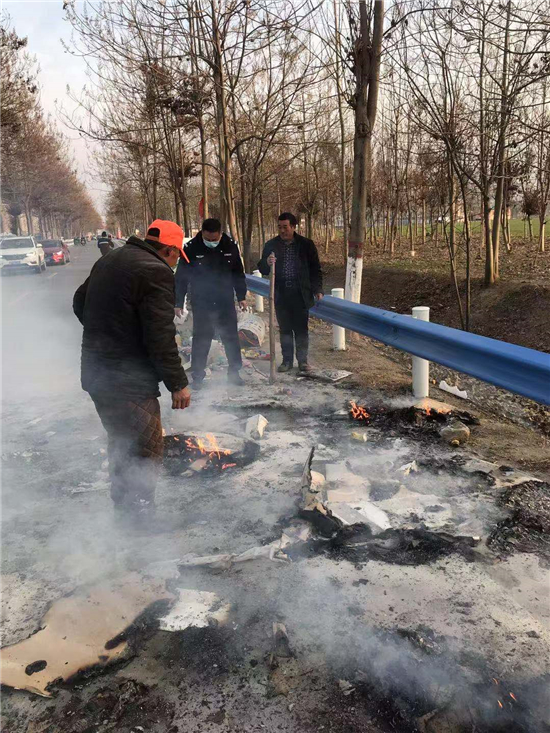 當(dāng)日下午4點左右,太康縣交警大隊二中隊指導(dǎo)員南應(yīng)開及輔警郭旗全、魯?shù)?、尹晨豪正在趙堂村附近巡邏時,猛然看到前方一輛電動三輪車上有煙氣冒出,巡邏民警加速趕到。原來是一名老漢的一輛拉著廢舊紙箱的電動三輪車著了火,一車廢紙和塑料瓶散落一地正在燃燒,火越燒越旺,只見老漢正在手忙腳亂地滅火。這輛三輪車上拉的全是廢塑料、硬紙殼等易燃物,而且當(dāng)時正刮著風(fēng),如果不及時滅火任由火勢蔓延,后果將不堪設(shè)想??吹酱饲闆r后,南應(yīng)開迅速從警車上拿出滅火器秒變“消防員”,對著起火的物品進行滅火操作,同時安排輔警對過往行人和車輛進行疏導(dǎo)。由于發(fā)現(xiàn)和撲救及時,在民警的緊急救援下,火源很快被眾人合力撲滅。對太康交警面對火情臨危不亂、果斷處置、幫助群眾的行為,老漢車主和過往群眾紛紛點贊。②6