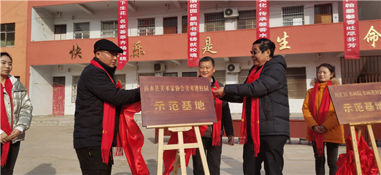 與會(huì)領(lǐng)導(dǎo)分別為“川匯區(qū)書畫院書法進(jìn)校園示范基地”“商水縣書法家協(xié)會(huì)書法進(jìn)校園示范基地”“商水縣美術(shù)家協(xié)會(huì)美術(shù)進(jìn)校園示范基地”揭牌。中國(guó)書法家協(xié)會(huì)會(huì)員、中國(guó)作家協(xié)會(huì)會(huì)員、周口師范學(xué)院特聘教授張華中,周口市書法家協(xié)會(huì)副秘書長(zhǎng)、川匯區(qū)文聯(lián)副主席游富華,以及我縣原政協(xié)副主席、商水縣美術(shù)家協(xié)會(huì)主席司新國(guó),河南省書法家協(xié)會(huì)會(huì)員、文聯(lián)主席劉秋玲,中國(guó)書法家協(xié)會(huì)會(huì)員、商水縣書協(xié)主席趙世貴 ,中國(guó)美術(shù)家協(xié)會(huì)會(huì)員郭保同,河南省書法家協(xié)會(huì)會(huì)員關(guān)保證、王艷飛、沈曉虹,河南省美術(shù)家協(xié)會(huì)會(huì)員李飛等市縣知名書畫家向?qū)W校捐贈(zèng)了墨寶。