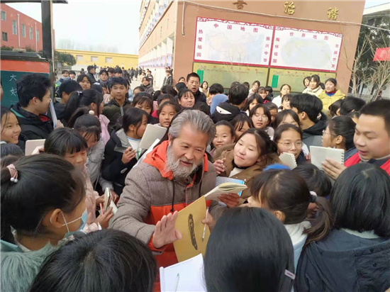 書畫家們的到來,受到學(xué)子們的歡迎,千名學(xué)生將書畫家們團(tuán)團(tuán)圍住,像追星一樣,討教書法藝術(shù)。書畫家門興致盎然,揮毫潑墨,留下 “上善若水”“業(yè)精于勤”、及花鳥圖、山水畫等作品100余幅,并與師生現(xiàn)場(chǎng)互動(dòng)、傳經(jīng)送道、指點(diǎn)學(xué)生書法作品的得失。