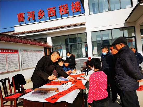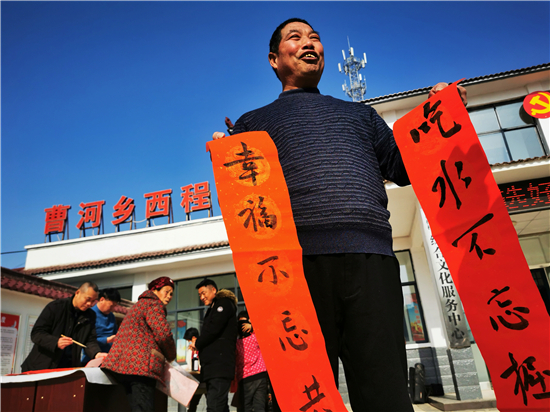 “吃水不忘掘井人,幸福不忘共產黨"。1月30日上午,在淮陽區(qū)曹河鄉(xiāng)程樓村,村民孫訓濤領到春聯(lián)后邊念邊樂,脫貧后的幸福生活溢于言表。當天,淮陽區(qū)文聯(lián)組織書法家下鄉(xiāng)義寫春聯(lián),受到群眾熱烈歡迎。