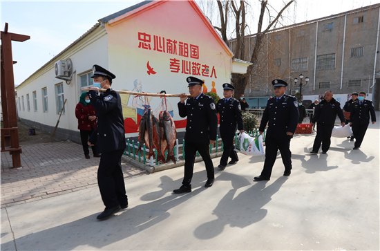 隨著春節(jié)日益臨近,該派出所所長(zhǎng)楊杰和大家商議,“送溫暖送祝?!被顒?dòng),應(yīng)該先從尊老愛(ài)幼開(kāi)始。于是,民警們購(gòu)買(mǎi)了60斤魚(yú)、100斤雞蛋和2袋面粉,利用中午休息時(shí)間來(lái)到敬老院,給老人們送上新春祝福。