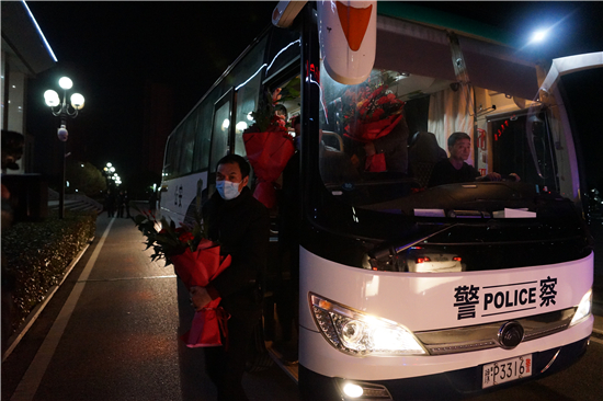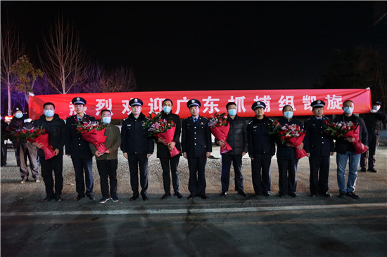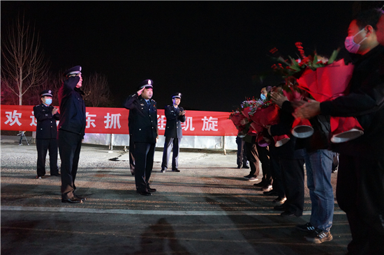 英雄凱旋,鮮花致敬。2月6日夜晚11時許,寧洛高速項城北收費站警燈閃爍、隊列整齊,項城市公安局在這里隆重舉行儀式,熱烈歡迎 “1.8”專案組民警勝利歸來。副市長、公安局長萬東偉,局黨委副書記、副局長陳重,局黨委委員、政辦室主任衛(wèi)偉,局黨委委員袁啟峰等領(lǐng)導出席儀式,部分民警代表參加了儀式。萬東偉同志代表局黨委對此案的成功偵破表示熱烈祝賀,真誠感謝專案組民警的辛勤付出,并向大家致以崇高的敬意。