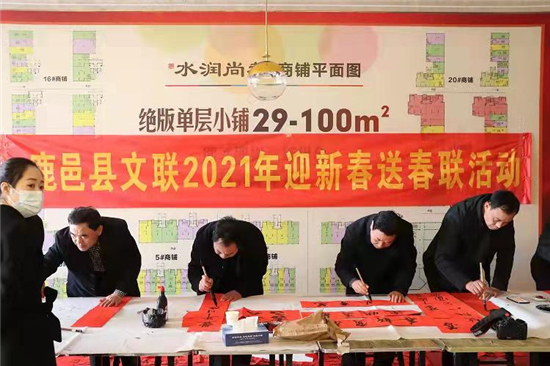 “我是做生意的,能幫我寫(xiě)一幅跟生意有關(guān)的春聯(lián)嗎?”2月7日,寒風(fēng)凜冽,鹿邑縣水潤(rùn)尚都、水潤(rùn)上苑兩個(gè)樓盤(pán)售樓處大廳卻春意融融。鹿邑縣文聯(lián)、縣書(shū)法家協(xié)會(huì)十余人走進(jìn)社區(qū)揮毫潑墨為業(yè)主送上濃濃的新春祝福。