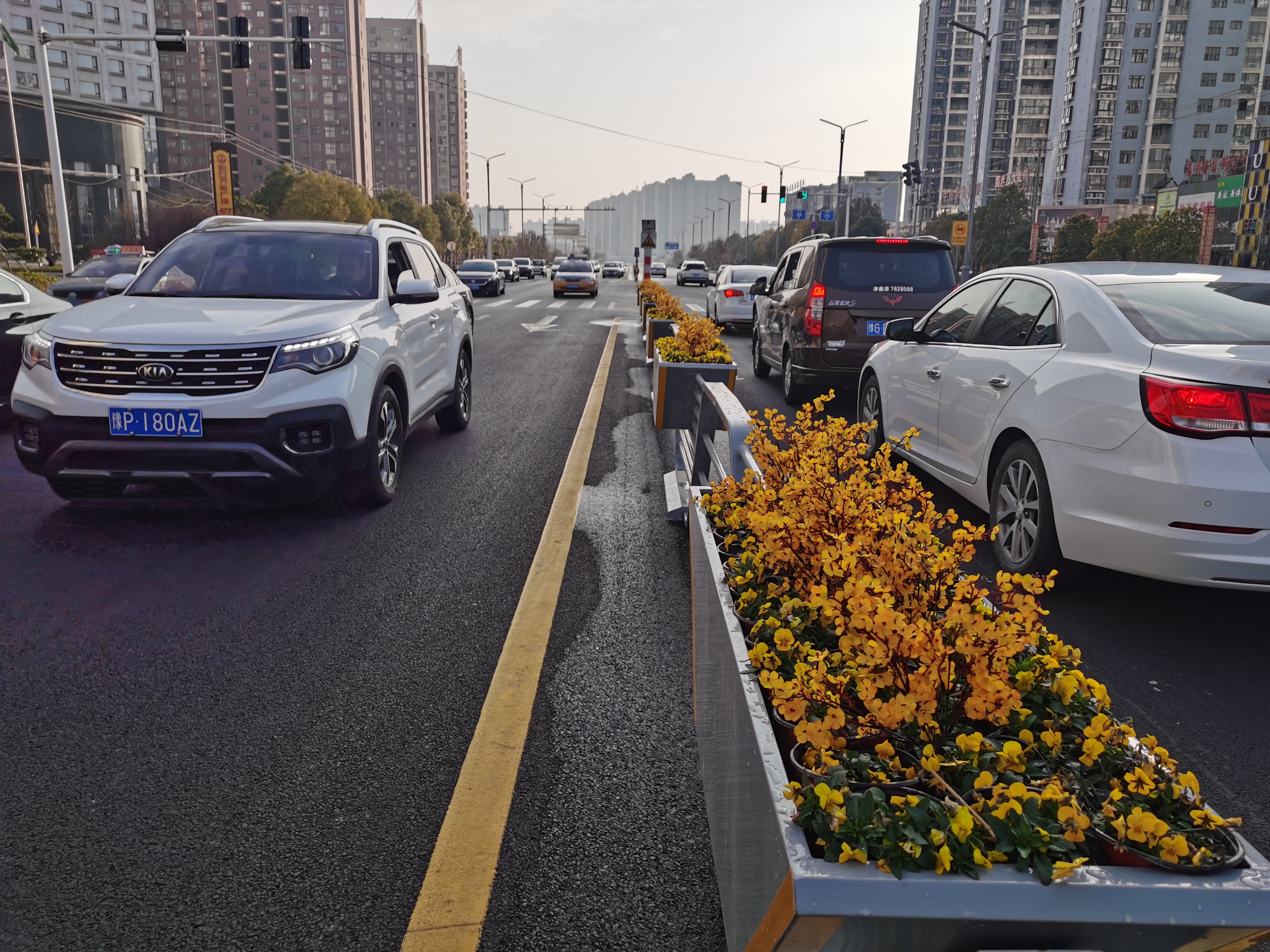 2月10日,走在商水縣陽城大道,發(fā)現(xiàn)快車道中間的欄桿換成帶花卉盒栽的新型欄桿,銀灰色的簡潔造型的欄桿、紅、藍(lán)、黃等各色花卉,扮靚了充滿節(jié)日喜慶氣氛的商水縣城。