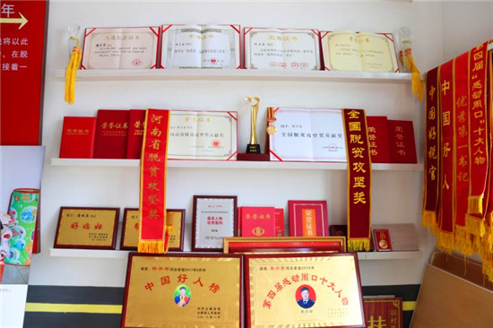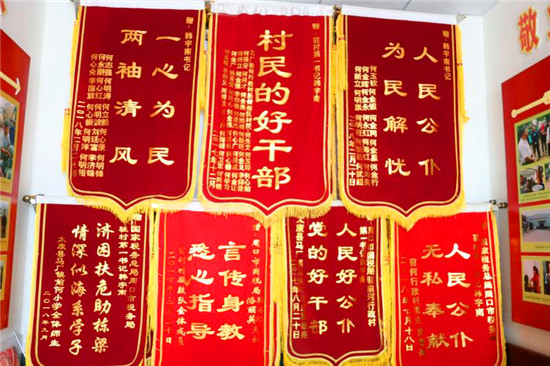 路修好了,村民為韓宇南送來了第一面錦旗。在以后的幾年里,群眾多次自發(fā)給韓宇南送來錦旗,近40面錦旗重重疊疊掛滿了村委會的整個北墻。