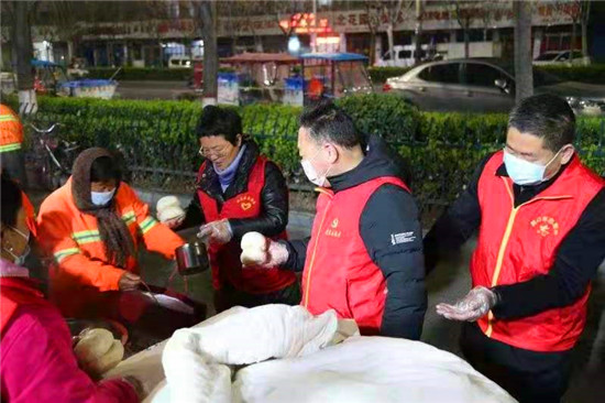 當(dāng)日早上5時(shí),在愛(ài)心粥屋里,示范區(qū)分局的志愿者們穿著紅馬甲,戴上口罩,立即進(jìn)入忙碌狀態(tài),大家既分工明確又相互配合,現(xiàn)場(chǎng)井然有序。他們?yōu)榄h(huán)衛(wèi)工人盛飯端菜,拿雞蛋饅頭,動(dòng)作迅速,熱情周到,有條不紊,個(gè)個(gè)忙得不亦樂(lè)乎。在這個(gè)清冷的早晨,因?yàn)橛辛藷釟怛v騰的飯菜和志愿者忙碌的身影,環(huán)衛(wèi)工人開(kāi)心地笑容,感受到濃濃暖意。
