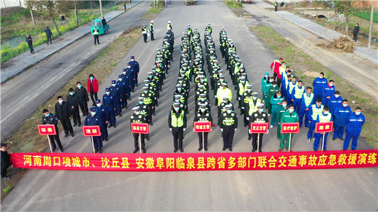 為進(jìn)一步健全完善涉及危險(xiǎn)品運(yùn)輸車事故應(yīng)急處置和搶險(xiǎn)救援機(jī)制,加強(qiáng)省際國省道安全管控,提高突發(fā)事件應(yīng)急處置和救援能力,經(jīng)共同研究決定,3月3日上午,河南省公安廳交警總隊(duì)組織周口市公安局交通管理支隊(duì)和安徽阜陽市公安局交通管理支隊(duì)聯(lián)合兩地交警、環(huán)保、消防、施救、120急救中心等多部門在兩市交界處舉行道路交通事故應(yīng)急救援聯(lián)合演練,演練內(nèi)容包括接處警、交通管制、環(huán)境監(jiān)測、營救被困人員、處置?;贰⑹鹿尸F(xiàn)場勘察、事故現(xiàn)場清理等內(nèi)容。