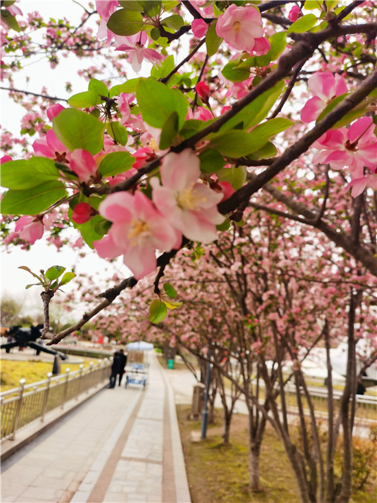 公園里的海棠花繼紫葉李花后,已經(jīng)進(jìn)入盛花期,最集中的地方在公園西門(mén)附近,一條美麗的海棠花小道正在靜待四方來(lái)客。樹(shù)上已經(jīng)開(kāi)滿粉紅色的小花,潔白的花瓣、微紅的花蕊。目前有不少市民來(lái)此觀賞。