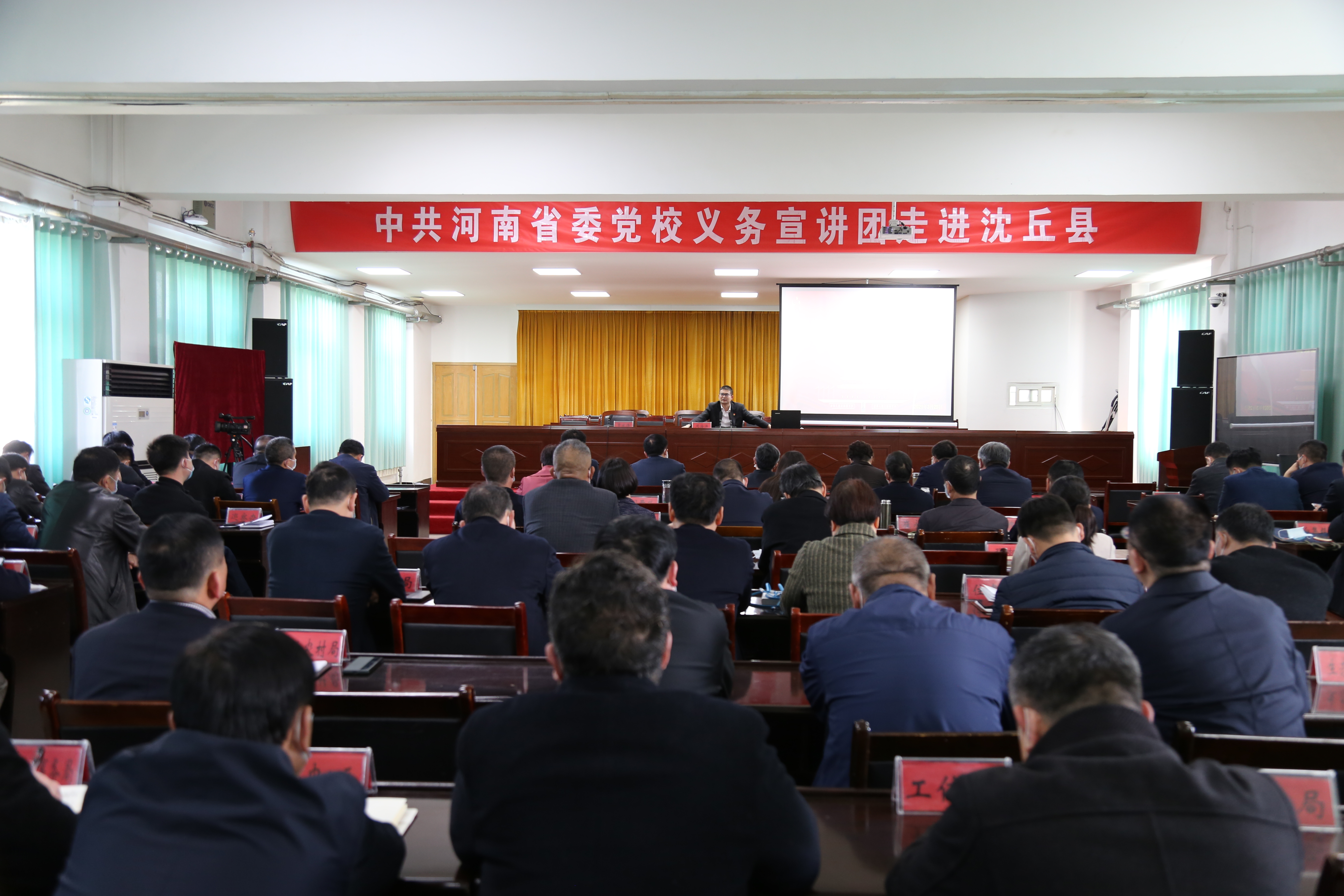 3月25日下午,中共河南省委黨校義務(wù)宣講團走進沈丘縣開展宣講活動?;矢α⑿?、賈慶偉、殷曉春、趙振、郝四春、劉和輝、呂孝坤等在家的縣四個班子領(lǐng)導(dǎo)及副處級以上干部與全縣近200余名黨員干部共同聆聽了宣講報告??h委副書記賈慶偉主持報告會。
