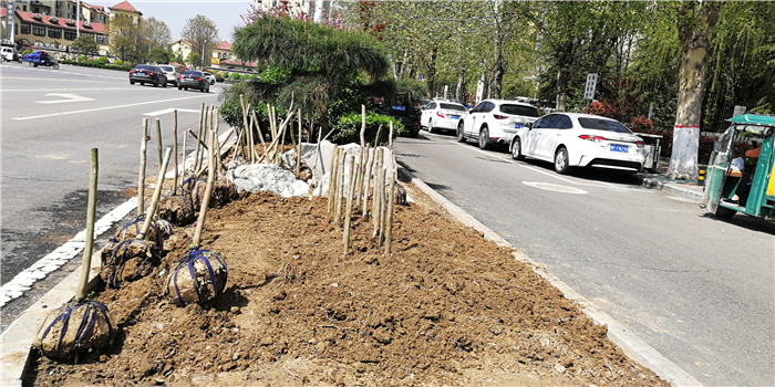 仲春時(shí)節(jié),我市積極打造街頭游園、口袋公園,增加市民休閑游樂場(chǎng)所。圖為園林工人正在施工。②7