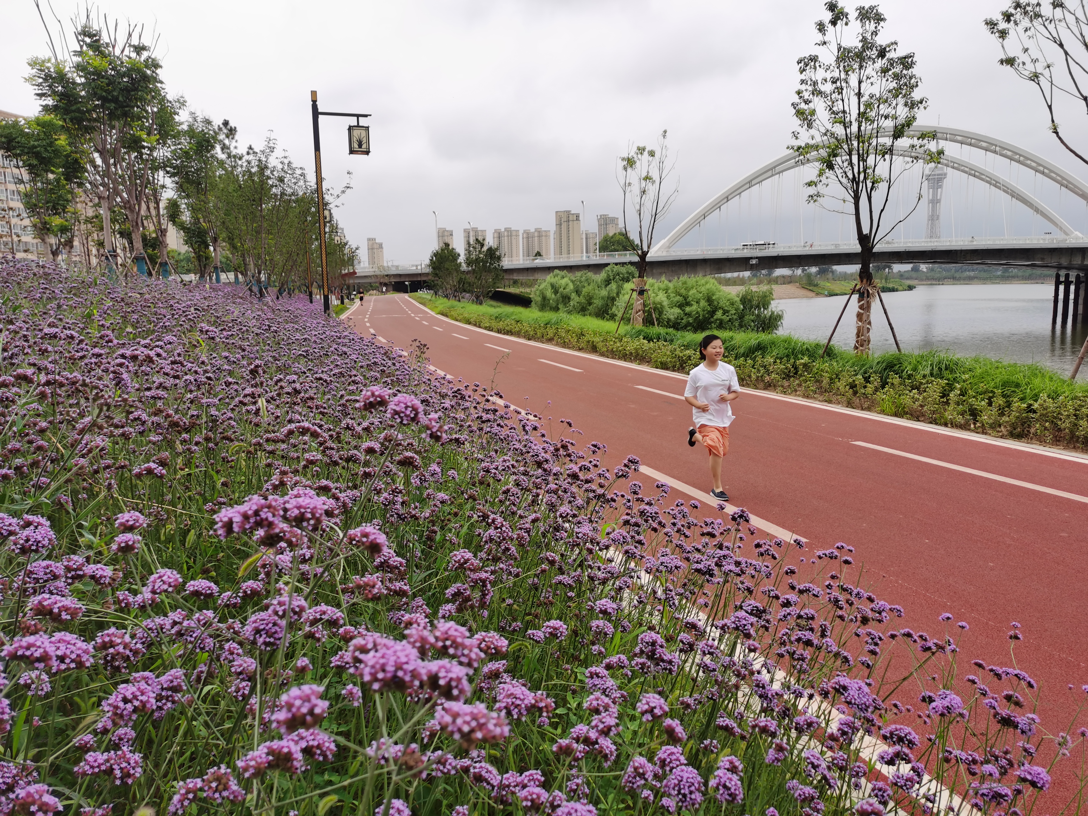 7月6日早晨,市民在馬鞭草花開(kāi)正盛的沙潁河北岸晨跑。