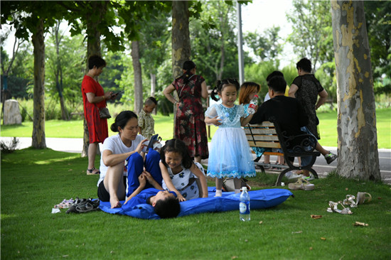 7月7日,不少市民帶著孩子在周口植物園內(nèi)休閑玩耍。進入了炎炎夏日,周口植物園里清新的空氣、大片綠蔭、盛開的鮮花十分吸睛,市民在林中穿行休閑漫步、孩子們快樂地蕩秋千……這里成了市民游玩消暑的好去處。③2