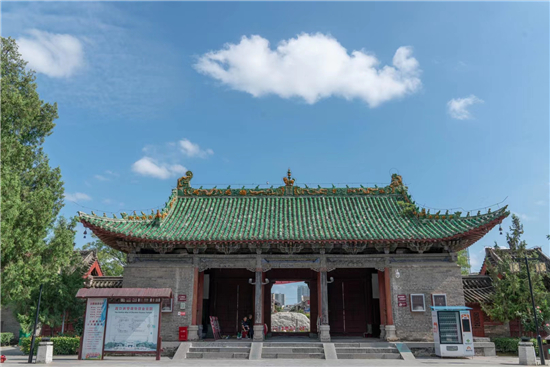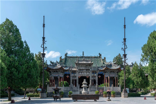 整個(gè)古建筑群為仿宮殿式,山門、鐵旗桿、石牌坊、碑亭、饗殿、大殿、河伯殿、炎帝殿、戲樓、拜殿、春秋閣由南向北,建于中軸線上,藥王殿、灶君殿和東廊房,財(cái)神殿、酒仙殿及西廊房在前院左右,東西看樓、東西配殿建在中院兩側(cè),老君殿、馬王殿、瘟神殿為東偏房,客房僧舍位于西院。是全國(guó)重點(diǎn)文物保護(hù)單位,國(guó)家AAAA級(jí)旅游景區(qū),國(guó)家三級(jí)博物館。
