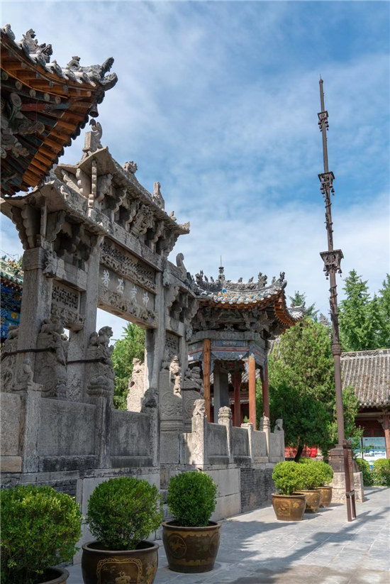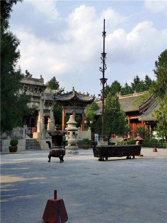 過山門,突現(xiàn)在眼前的是一對(duì)鐵旗桿。鐵旗桿高22米、重3萬余斤,且桿身鑄有銘文圖案、山水花卉、龍鳳鳥獸。