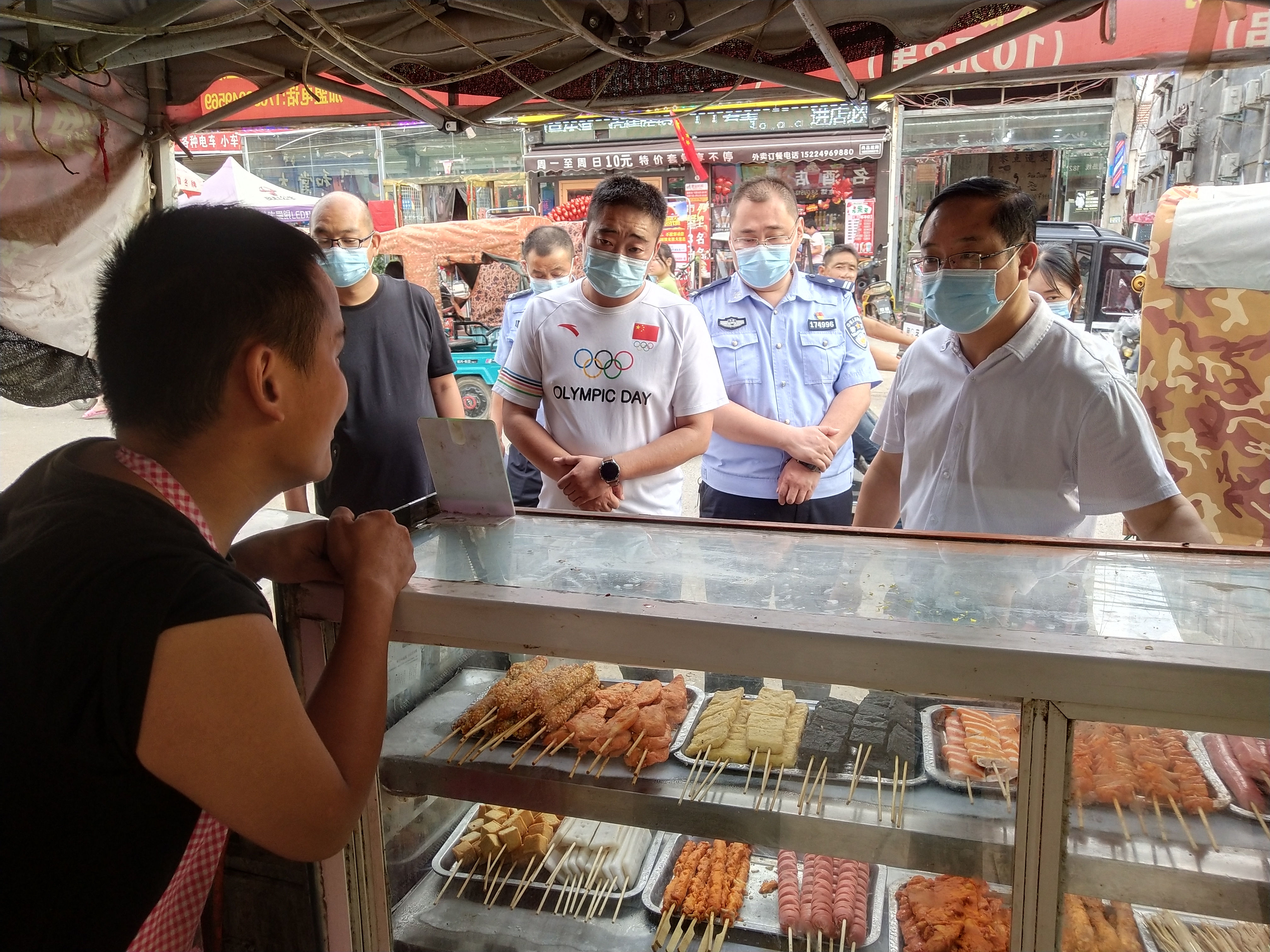 隨后,段文海一行又來到“佰宜家”生活超市,重點檢查了消防器材、應急安全設備以及疫情防控,指導超市負責人認真制定應急預案,完善工作舉措,確保國慶假期安全穩(wěn)定。“你們賣烤鴨使用液化氣不安全,必須立即整改……”“你們做油炸雞腿原料從哪采購的?占道經(jīng)營不行啊……”在集市流動攤點,檢查人員一針見血指出了存在的問題?!澳銈兊碾娋€老化、私拉亂扯有安全隱患必須盡快換掉,煙霧報警器沒有安裝到頂上需要重新調(diào)整位置,你講講如果發(fā)生火災如何使用滅火器……”在集市沿街商鋪暗訪檢查時,段文海等對一家床上用品專賣店業(yè)主提出嚴厲批評。派出所長蘇叢博、副所長劉來自現(xiàn)場傳授消防知識并給其下發(fā)了《限期整改通知書》。