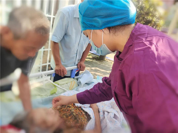 接到派單后,心血管二病區(qū)護(hù)士長孫娜第一時間與患者家屬取得聯(lián)系,得知這位近百歲的老人是在凌晨一點多自行把胃管拔了出來,早晨還沒有進(jìn)食,于是帶著護(hù)士陳珍珍第一時間趕往了患者家里。還未下車,她們就看到患者家屬在門口著急地張望:“怎么這么快,太好了,我的老母親不用餓肚子了?!?/p>