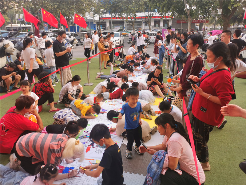 10月1日下午,在位于周口市中心城區(qū)七一路與中州大道交叉口的萬(wàn)果園家庭茂商超前,近百名小朋友聚集在一起用手中的畫(huà)筆表達(dá)對(duì)祖國(guó)母親的祝福。