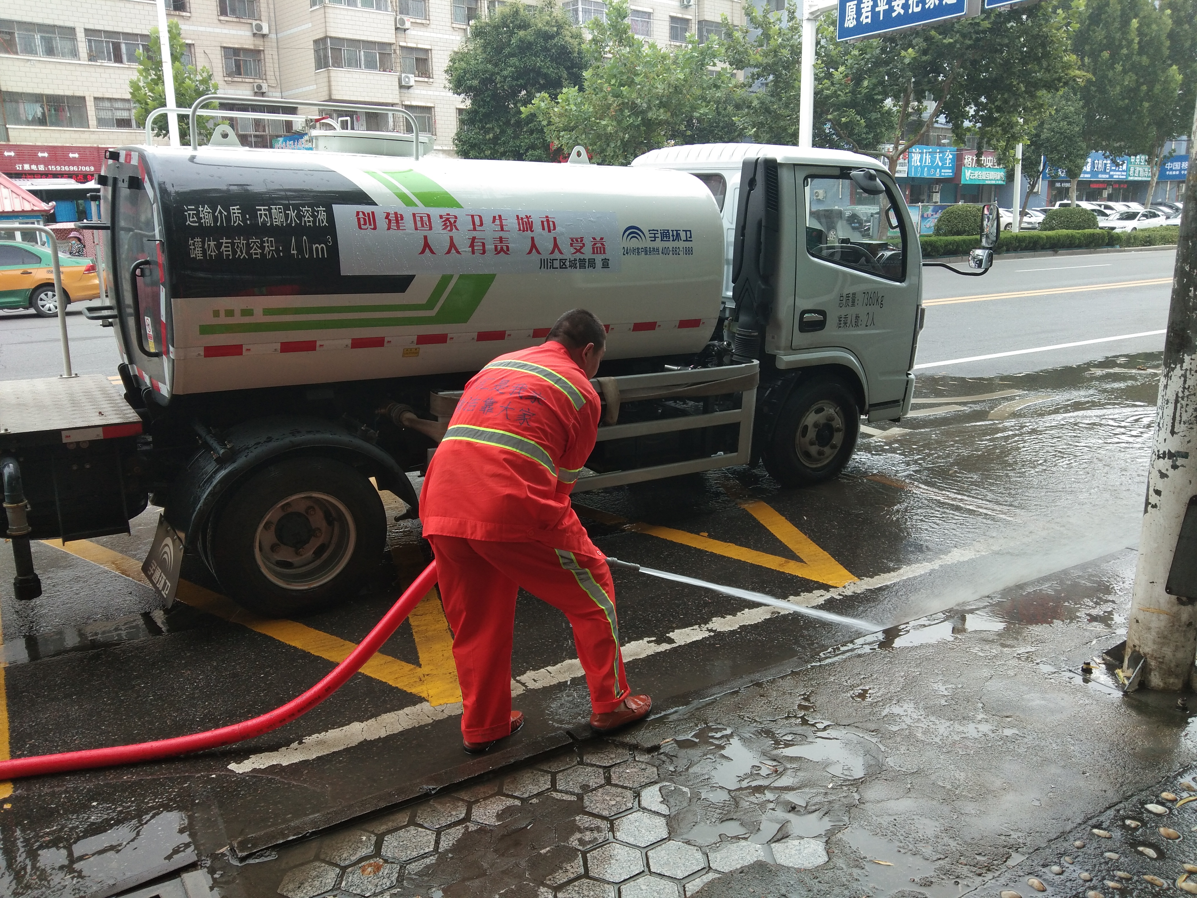 10月4日晚11時許,大雨如注,市區(qū)育新街行人稀少,李宗喜在雨中向一位保潔人員示范“洗路”,身上的衣服已經(jīng)濕透。