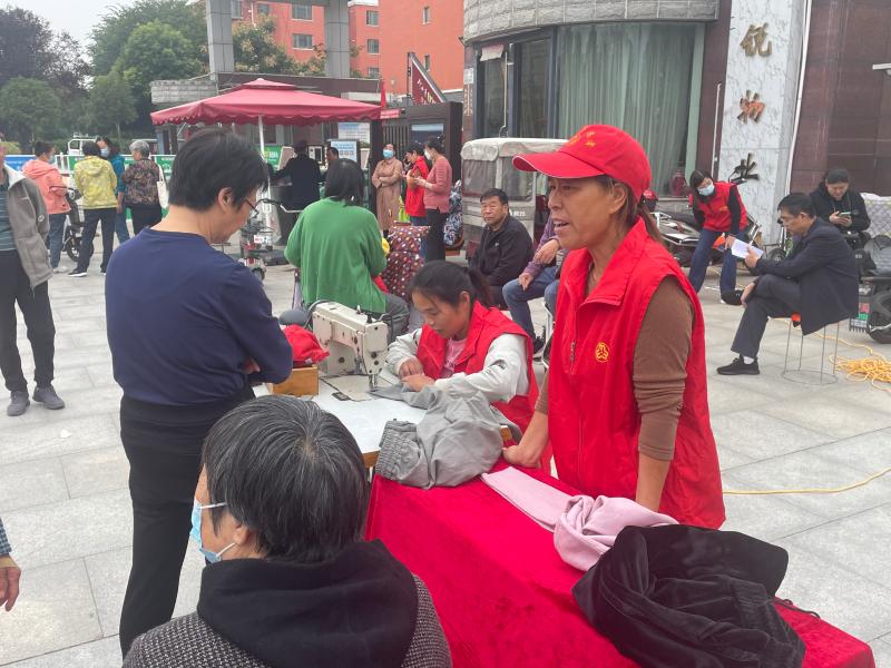 10月14日,在川匯區(qū)文昌大道的中原社區(qū)A區(qū)大門口,數(shù)十名身穿紅馬甲的志愿者在忙著幫社區(qū)老年人截褲腳、剪頭發(fā)、補鞋子。志愿者們深入社區(qū),為老年人服務。此外,他們還在蓮花路、太昊路、文明路、交通路街頭值勤,助力文明周口建設。①5