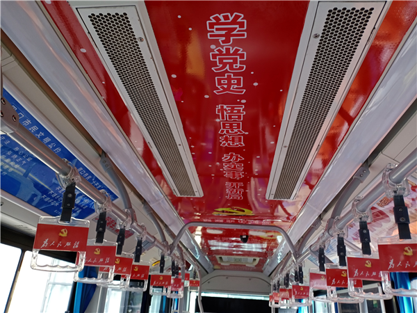 圖片說明:10月25日,記者在周口市公交總公司院內看到,一輛車頭前印有“紅色主題班線”標識的公交車格外引人注目,雖然該車的外形與其他車差別不大,可是車廂內貼滿了紅色標語口號,給人耳目一新的感覺。記者看到,車廂內的扶手、座椅及車頂上都貼有“為人民服務”“學黨史、悟思想、辦實事、開新局”“革命小故事”等宣傳內容。③2